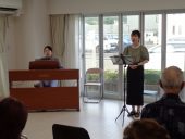 続いて、最近逝去した橋幸夫さんを偲んで『潮来笠』『いつでも夢を』を歌いました。ここでは、発声練習でやった「頬の筋肉を上げてにぃぃぃ~」を活用しました。演歌向きの、高い声が出るそうです。にッと歯を見せて歌うと、ちょっと橋幸夫ふうにも見えますね。後半のミニコンサートでは、満梨奈さんがモーツァルトのピアノソナタハ長調K.545を演奏しました。「さわやかな秋晴れにちなんで…」との選曲で、今日の青空にぴったりですね。軽やかな音の連なりが小気味よく、耳に心地よく、モーツァルトがごきげんで鼻歌をうたっているようにも感じました。ピアノからきらきらした光の粒が湧き上がってくるようです。おもわず知らず手が動いて、ひらひらと小さく指揮をしている人がいました。