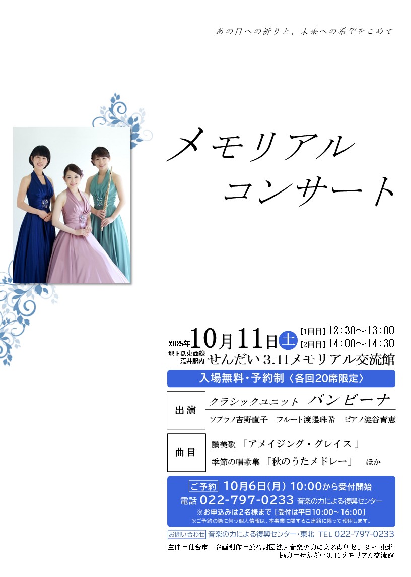 東日本大震災の月命日にあたる11日、せんだい3.11メモリアル交流館を会場に「メモリアルコンサート」を行ないます。今月の出演はクラシックユニット バンビーナ(ソプラノ吉野直子さん、フルート渡邉珠希さん、ピアノ澁谷育恵さん)のみなさんです。