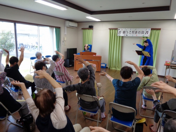 音楽リーダーはソプラノ大河原真歩さん(仙台オペラ協会)とピアノ大岩千華さんです。いつも楽しい趣向を凝らすお二人、今日は鮮やかなブルーの衣装で登場して参加者の目を惹きました。「目覚ましい」とはまさにこのことですね。大阪万博のキャラクターをイメージしたそうですよ。歌う前にはストレッチ、ゆっくり伸びをして準備をします。大河原さんが「ピアニストは準備体操するんですか?」と質問すると、大岩さんは「しますね。私は脇腹をのばします」と答えました。鍵盤を右へ左へ、ダイナミックに移動するピアニストはアスリートでもあるわけです。