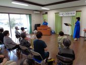 その後、カスタネットが配られて、みなさんにビゼーのオペラ「カルメン」の『ハバネラ』をご一緒していただきました。「タン、タ、タンタン」のリズムがやがて自由な感じにほどけていきましたが、演奏するお二人はリズムの乱れにつられることなく、きりっとした演奏で締め、喝采を浴びていました。最後はみんな一緒に『切手のないおくりもの』を歌って、なごやかにお開きとなりました。