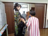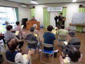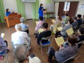 続く発声練習では、秋にちなんで虫の声を活用し、すばやく「かなかなかな…」と発音して滑舌をきたえるワーク、「み~んみ~ん」と鼻を響かせるワーク、そこから派生して「んだっちゃ!んだべっちゃ!」と仙台弁ならではの破裂音を多用したワークをおこないました。本日の課題曲は、リクエストにお応えして『旅愁』『見上げてごらん夜の星を』『あの素晴らしい愛をもう一度』です。大河原さんが歌の作られた背景や表現の細かいコツなどを説明しますと、みなさん「なるほど~」と感情が入って、歌がぐっと立体的になりました。男性が数名参加していたこともあって、歌声が豊かに響き、音楽リーダーのおふたりは「すごーい!」とおどろいていました。