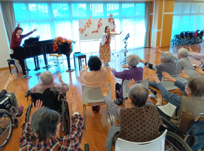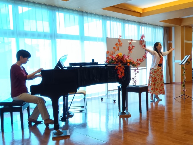 後半はミニコンサートとして、季節の唱歌を組み合わせた「秋のメドレー」や、昭和の大歌手である美空ひばりの曲などが披露されました。優子さんの豊かな声はマイクなしでも充分に響き、みなさんは感心して聴き入っていました。歌につられて踊っているような人もいましたよ。