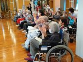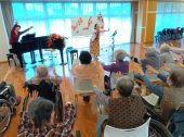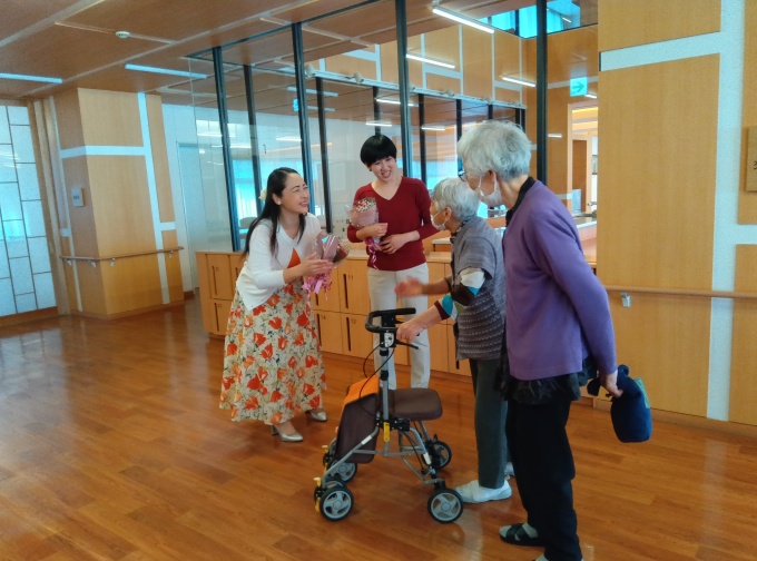本日の出演はメゾソプラノ後藤優子さんとピアノ田村聡子さん。この施設から徒歩5分の荒井東市営住宅にて隔月開催されている「音楽サロン」の音楽リーダーを務めるお二人です。昨年度、仙台市主催の「こんにちはコンサート」でこの施設を訪れて素晴らしい演奏を披露したお二人、施設スタッフさんからの熱いラブコールを受けての再登場となりました。今日は長期療養の方々とショートステイ利用の方々に分けて、2回おこないました。どちらも車椅子で参加する方が多く、「できる範囲で準備体操しましょう!」と、両手をグーパーしながら伸ばしたり縮めたり、ゆっくり首を回したりしました。