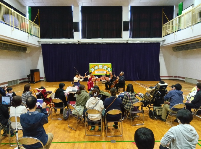 音楽プログラムをコーディネートしています。今日は仙台市太白区にある宮城県立西多賀支援学校に伺いました。出演は杜の弦楽四重奏団のみなさん(ヴァイオリン叶千春さん、ヴァイオリン駒込綾さん、ヴィオラ齋藤恭太さん、チェロ塚野淳一さん)です。