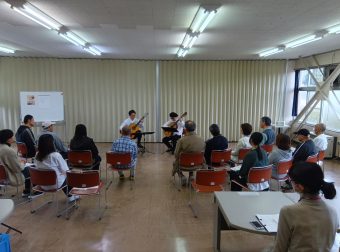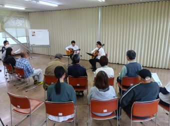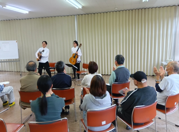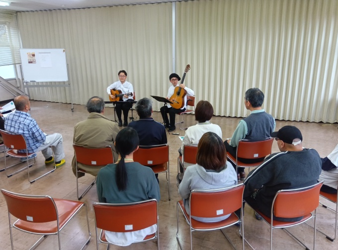 演奏家お二人の師匠である佐藤弘和さんが編曲した『赤とんぼ幻想曲』は、おなじみの童謡『赤とんぼ』のフレーズが次々に展開していきます。「赤とんぼが世界各国を旅しているイメージです」と正隆さんが解説すると、身を乗り出して耳を傾ける人がいました。ギターを打楽器のように叩いたり、ハーモニクスで不思議な響きを作ったりと、目でも耳でも楽しめる演奏でした。お二人が、クラシックギターは自分の爪で弾くことや、爪の保護に気を遣うことを話すと、みなさん「へえ~」と興味深そうにしていました。また、「この会場ではギターの音が響き過ぎずに、ちょうどよい生の音で聞こえますね」と褒めると、いつもの作業室が特別な空間に感じられたようで、感慨深そうにぐるりと見まわしている人がいました。