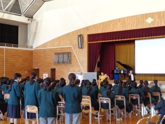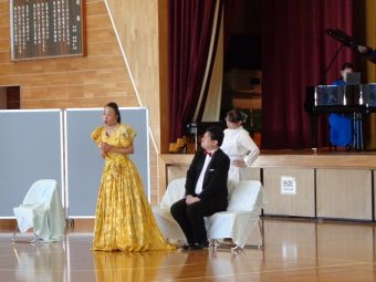 音楽プログラムをコーディネートしています。今日は仙台市若林区にある仙台市立八軒中学校に伺いました。出演は仙台オペラ協会のみなさん(ソプラノ菊池里津子さん、ソプラノ谷萌実さん、メゾソプラノ野田みのりさん、バリトン野崎貴男さん、ピアノ大岩千華さん)です。