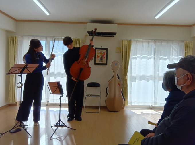 今日は仙台市若林区にある復興公営住宅の六郷市営住宅に伺いました。出演はフルート櫻井希さんとチェロ佐々木杜洋さんです。