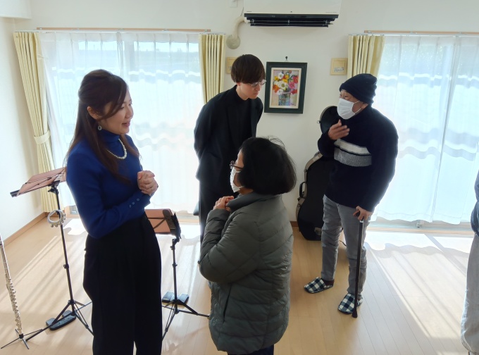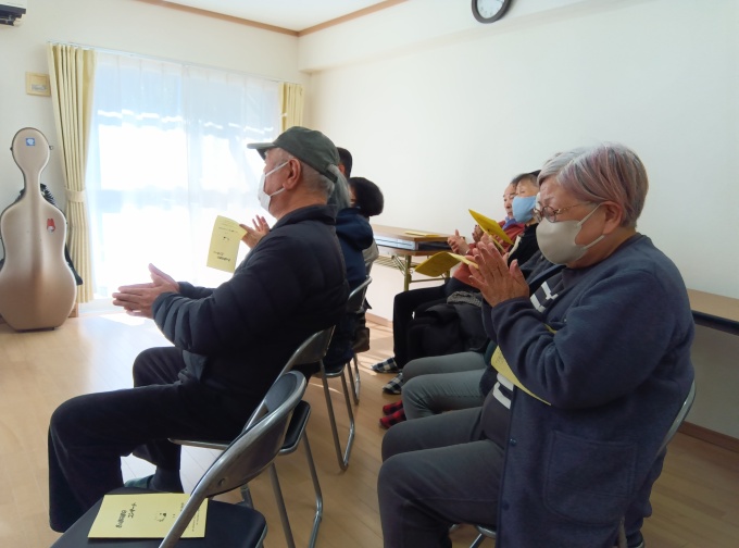 小さなワンルームの集会所で、楽器の音が程よく響きます。お二人が「演奏しやすい会場ですね」と言うと、集まったみなさんは「え、そうなんですか~」「へえ~」と、集会所の意外な一面を発見した様子。