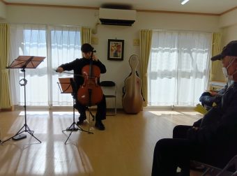 プログラムは懐かしの映画音楽やポップス等を中心に構成されていました。あいだにバッハの名曲やクリスマスメドレーもあって、さまざまな音色を楽しめる、親しみやすいものでした。また、お二人がそれぞれの楽器の仕組みを説明する場面もあり、みなさん興味深そうにしていました。佐々木さんはバッハ『無伴奏チェロ組曲』について解説しました。「全部で36曲もあって、演奏すると2時間半もかかるんですけど、今日はその中から有名な作品をお届けします」と、第1番プレリュードを演奏しました。或る方は「おれ、チェロが好きなんだよね。小学校の時、音楽を聴かせてくれた先生がいてさ…」と思い出を語りました。「いまだにその先生の名前も覚えているよ」と感慨深い様子でした。