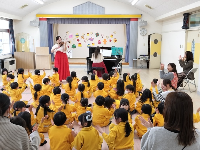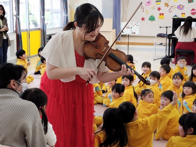 園児たちはよっぽど楽しかったようで、「ヴァイオリンってなあに?」と言っていた子ども達が「ヴァイオリンならってみたい!」に変わっていたとのこと。先生方からは「プロの生の演奏を前にした子ども達の目は輝いていました。夢中になっている姿に、私たち教師も刺激をうけました」という嬉しいお言葉をいただきました。
