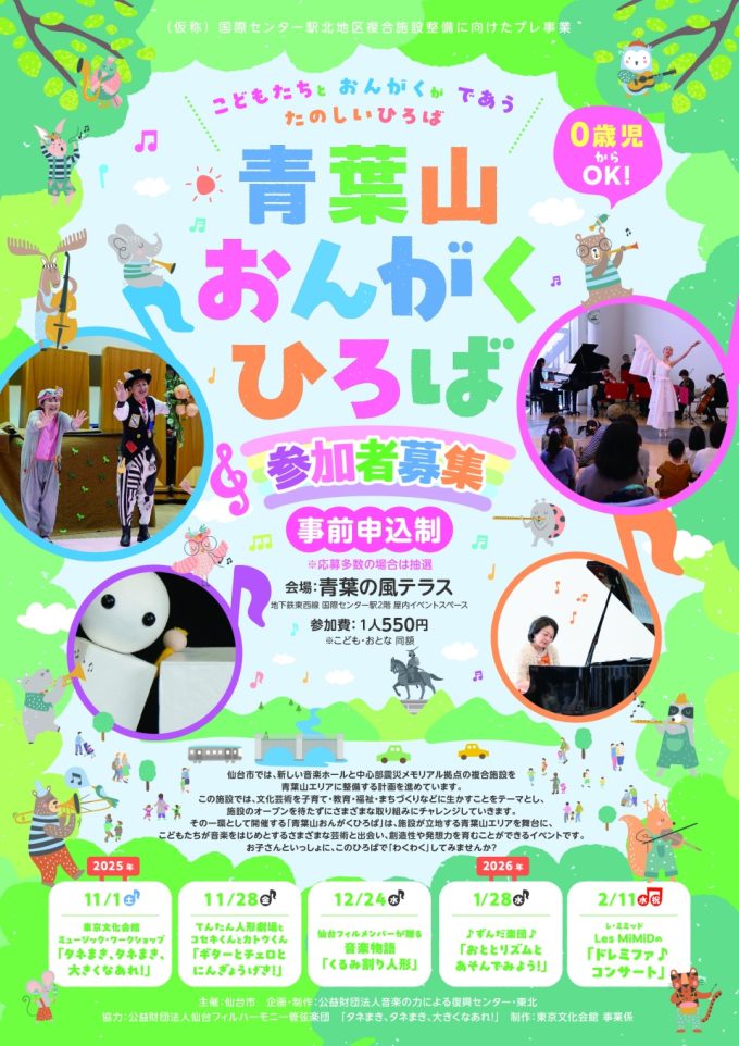 仙台市では、新しい音楽ホールと中心部震災メモリアル拠点の複合施設を整備する計画を進めています。この施設では『文化芸術を子育て・教育・福祉・まちづくりなどに生かす』ことを大きなテーマとし、施設のオープンに先立ち、さまざまな取組みにチャレンジしていきます。その一環として開催する「青葉山おんがくひろば」は、施設が立地する青葉山エリアを舞台に、子どもたちが音楽をはじめとするさまざまな芸術と出会い、創造性や発想力を育むことができるイベントです。