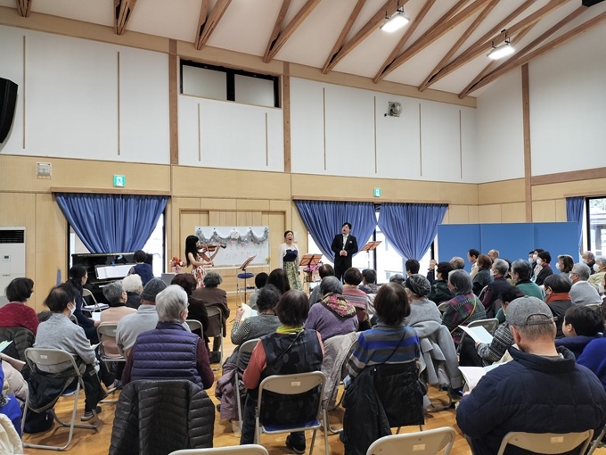 この地域は翠さんの地元なこともあり、とてもアットホームな雰囲気です。翠さんや野崎さんの軽妙なトークを交えながらのコンサートは、お客さんと一緒に『たきび』や『いつでも夢を』を歌ったりして、温かく和やかな空気に包まれていました。