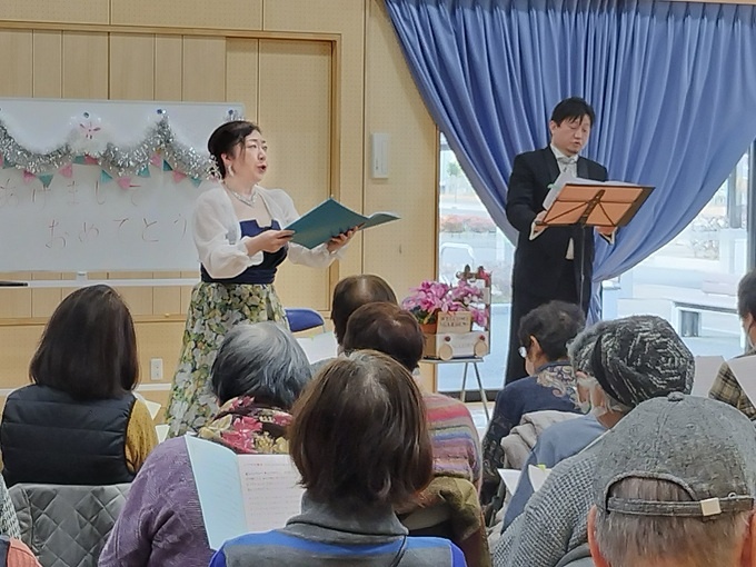 出演は鳴瀬地区出身のソプラノ齋藤翠さん(仙台オペラ協会)、バリトン野崎貴男さん(同)、ヴァイオリン梅津亮子さん、ピアノ可沼美沙さんです。例年のコンサートは声楽とピアノのアンサンブルでしたが、今年は新たにヴァイオリンの梅津さんが加わり、より一層華やかなアンサンブルとなりました。新春コンサートにふさわしく、プッチーニ、ビゼー、モーツァルトほかオペラの名曲の数々と、懐かしのミュージカルナンバーや日本の歌をたっぷりお楽しみいただきました。