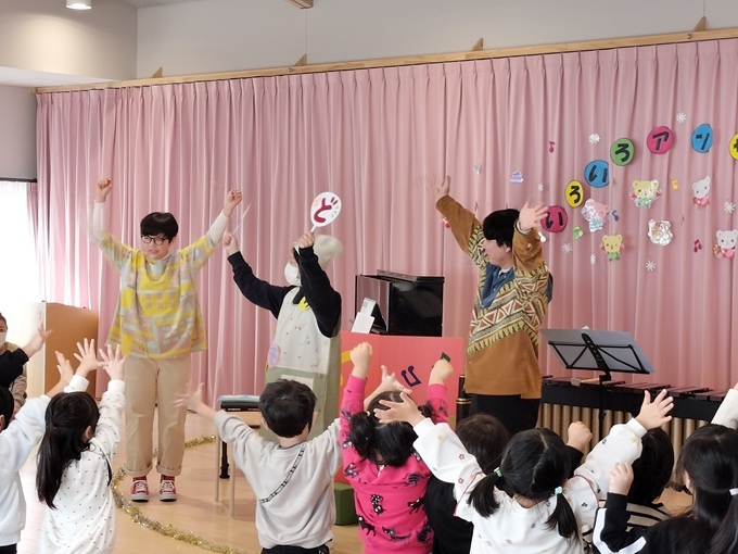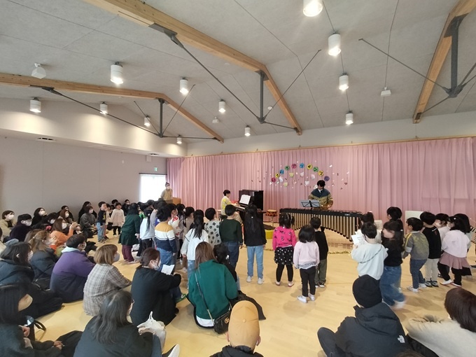 開園1年目の記念に親子行事として開催したいとの要望があったので、こどもたちの他、沢山のお父さんやお母さんも参加したアウトリーチとなりました。こどもたちは、マリンバという普段あまり見ない楽器に興味津々で、目の前で鳴らされる音に聴き入っていました。また、音楽に合わせて手遊びやボディパーカッションをするなど、体を動かしながら音楽を楽しんでいました。