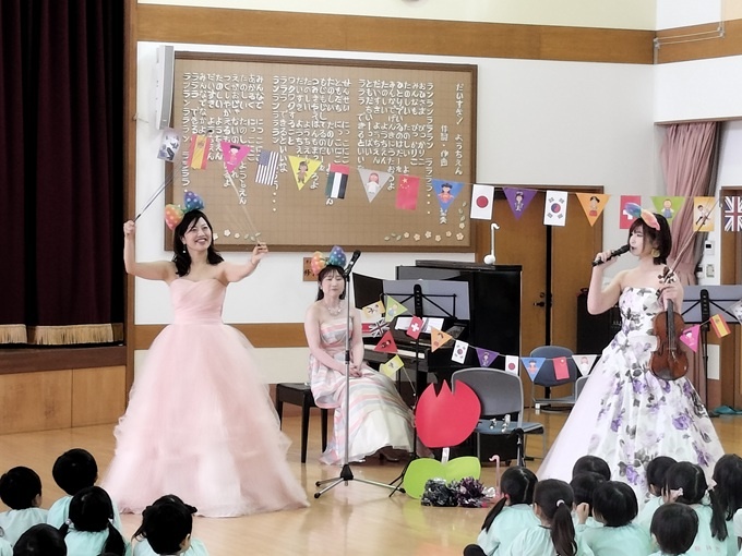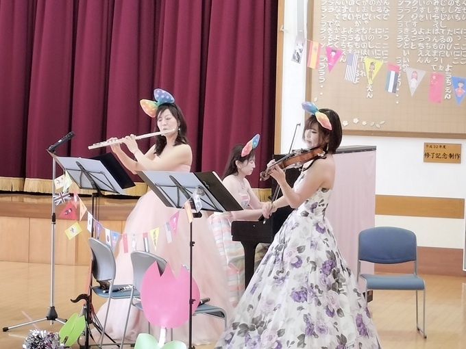 今朝は、遠田郡にある美里町立ふどうどう幼稚園へうかがいました。出演は、トレシスのみなさん(ヴァイオリン門脇和泉さん、フルート千葉展子さん、ピアノ門脇麻美さん)です。