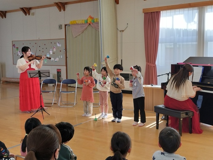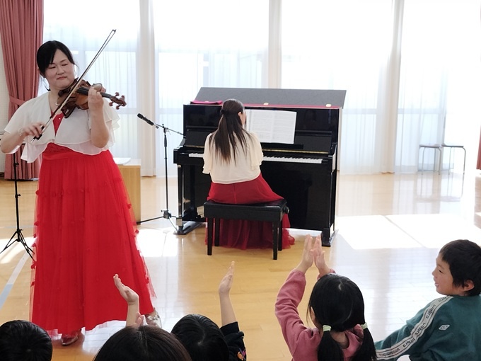 ヴァイオリンとピアノのアンサンブルで、子供にもわかりやすいクラシックや、幼稚園からリクエストのあったアニメソングなどを演奏しました。また、演奏を聴かせるだけでなく、5歳児のハンドベル演奏との共演や、音楽に合わせた絵本の読み聞かせなどもあったため、こどもたちは興味津々で、目を輝かせながら音楽を楽しんでいました。